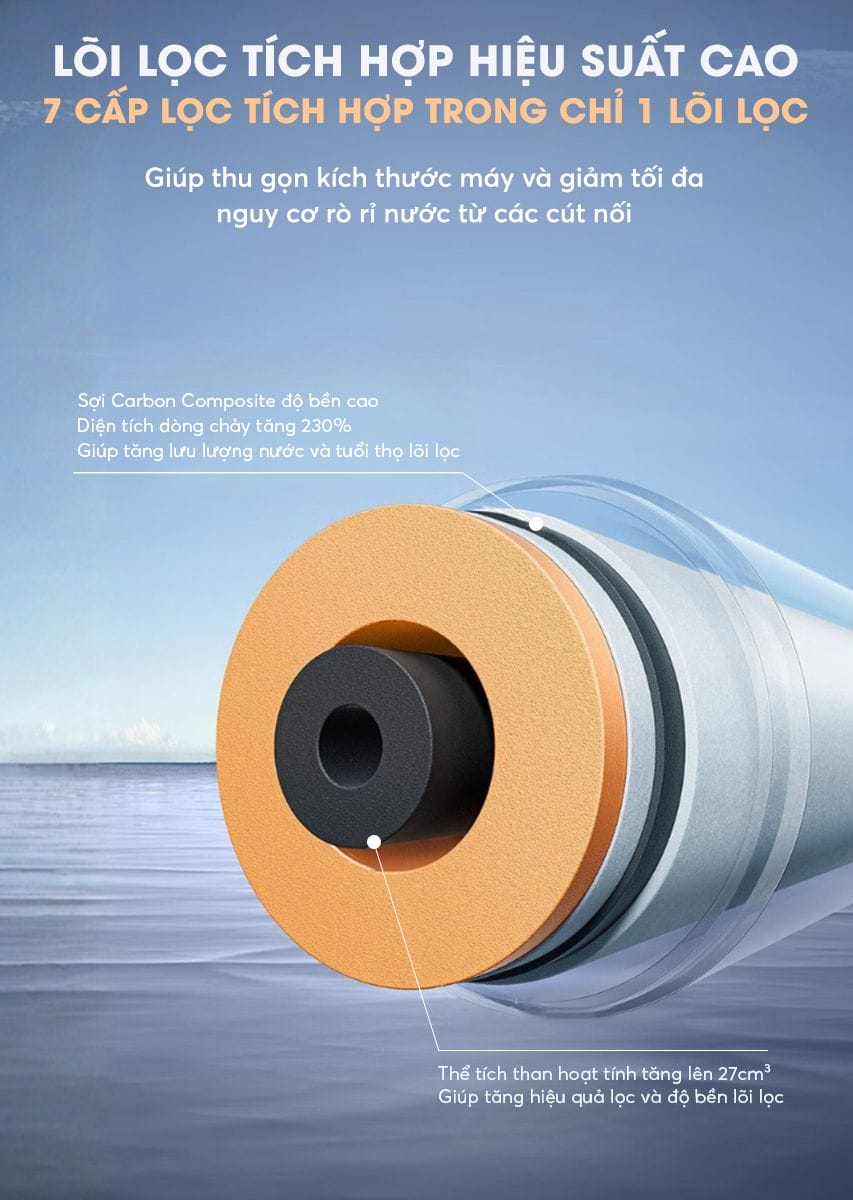 - 7 cấp lọc tích hợp trong 1 lõi lọc hiệu suất cao