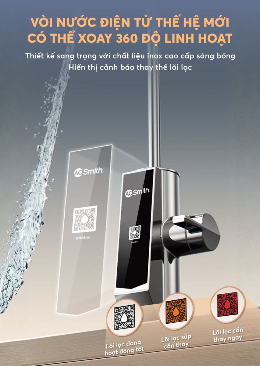 Vòi nước điện tử thế hệ mới của máy lọc nước A. O. Smith R700Slim được chế tạo từ thép không gỉ cao cấp, đảm bảo độ bền vượt trội, an toàn cho nguồn nước và giữ bề mặt luôn sáng đẹp theo thời gian. Trên thân vòi tích hợp hệ thống cảnh báo thay thế lõi lọc thông minh, giúp người dùng chủ động theo dõi tình trạng lõi và duy trì chất lượng nước tinh khiết ổn định. Thiết kế vòi xoay 360° linh hoạt hỗ trợ lấy nước thuận tiện ở nhiều vị trí, đặc biệt phù hợp với không gian bếp hiện đại, vừa tối ưu trải nghiệm sử dụng vừa nâng tầm thẩm mỹ tổng thể cho căn bếp.
