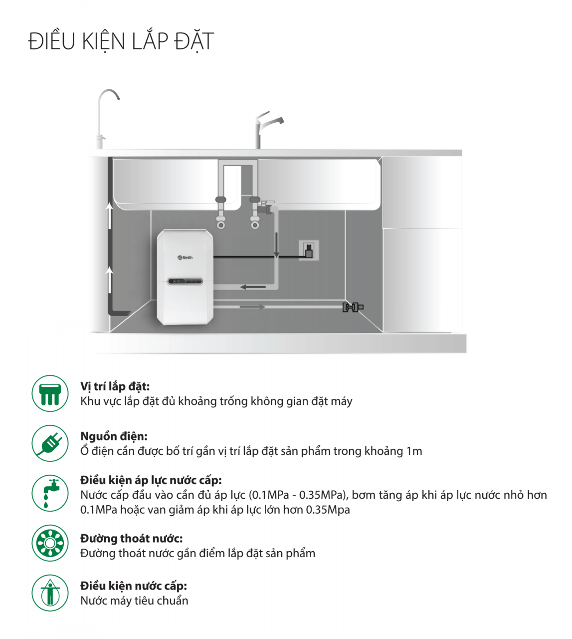 | Áp suất nước cấp phù hợp | 0.1MPa ~ 0.35MPa |