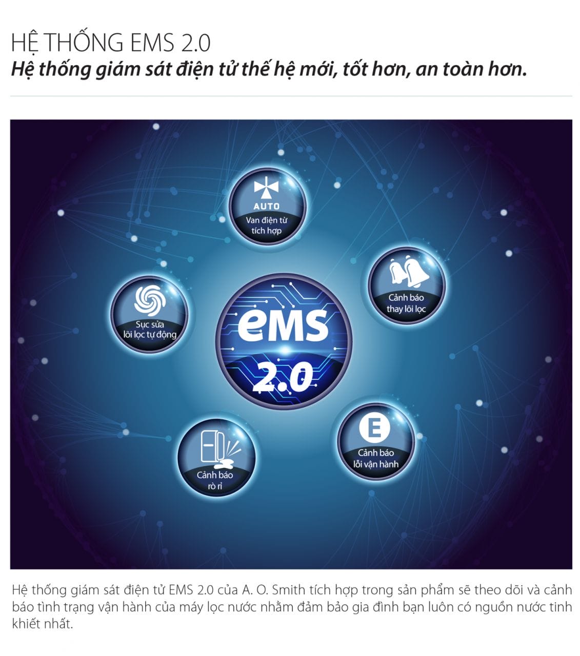 Hệ thống giám sát điện tử EMS 2.0 thế hệ mới của A. O. Smith VITA tích hợp trong sản phẩm giúp đồng bộ hoạt động của các bộ phận, theo dõi và cảnh báo tình trạng máy (thay lõi, rò rỉ, lỗi vận hành), tự động sục rửa lõi lọc đảm bảo máy luôn vận hành ổn định.